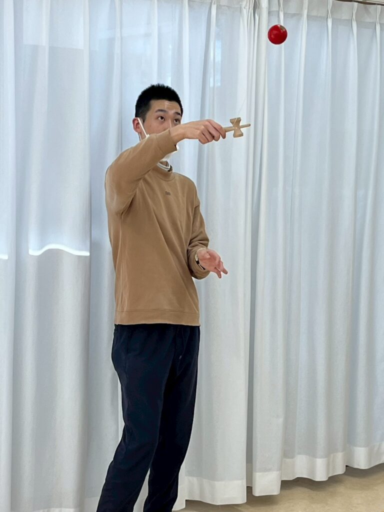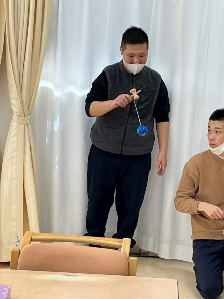 『けん玉、駒回し、福笑い、羽子板、かるたなど、昔の正月遊びをしました。みんなできるかなぁ・・(^^;)』